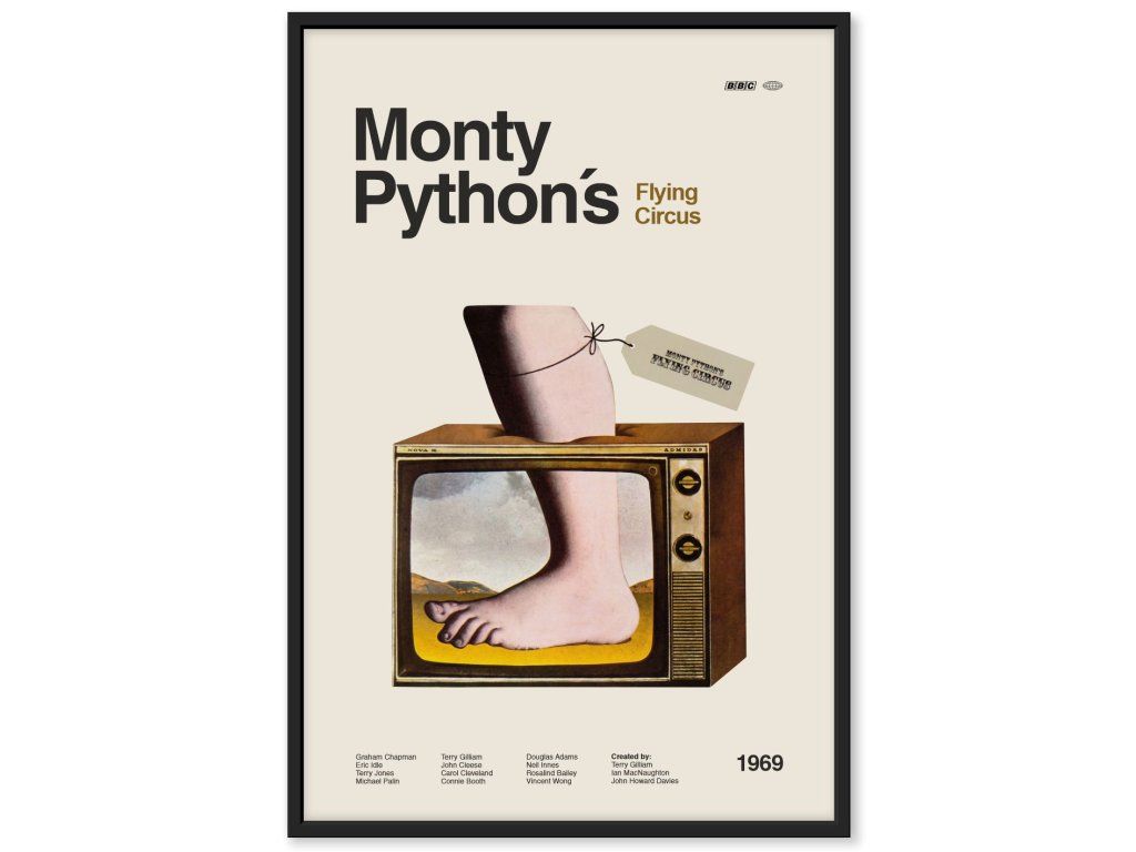 Autorský minimalistický plakát inspirovaný kultovním britským skečovým seriálem, který běžel v letech 1969–1974 a proslavil se svým surrealistickým humorem, nečekanými pointami a ikonickými scénami. Monty Python zásadně změnil způsob, jakým se tvoří komedie.