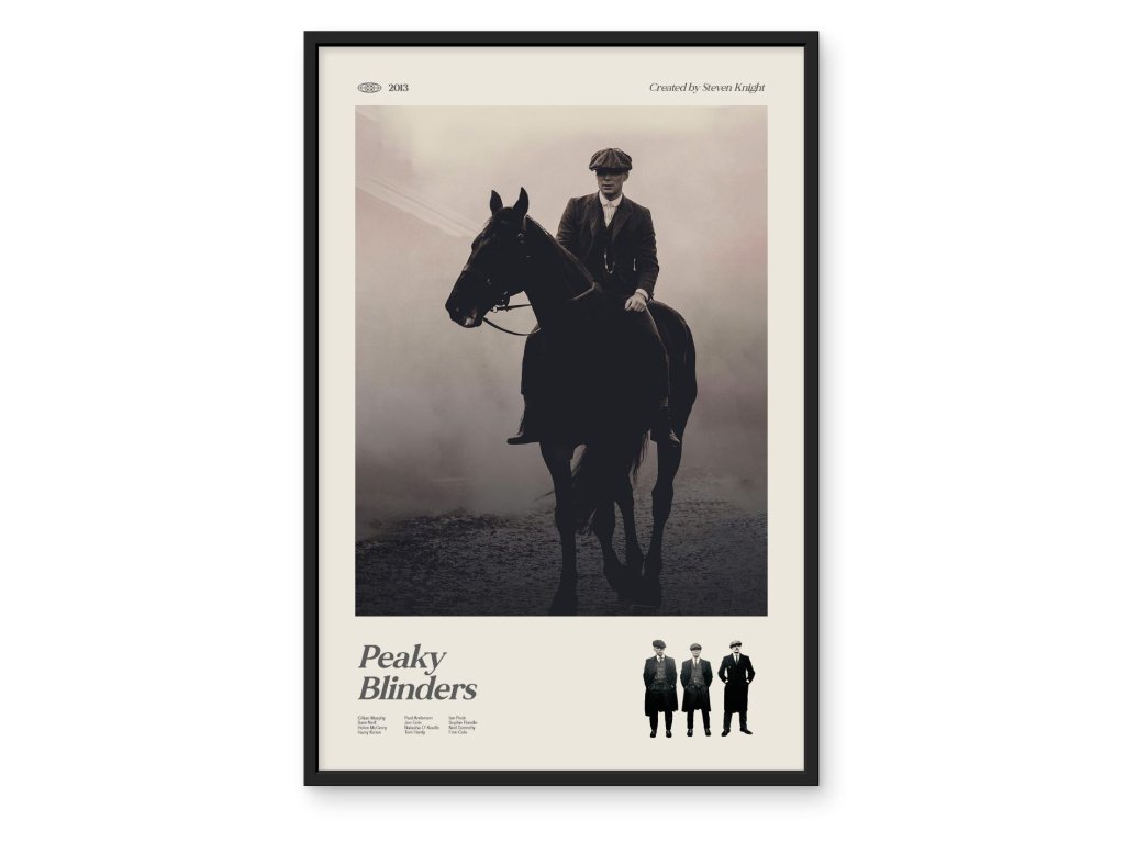 Designový plakát inspirovaný ikonickým seriálem Peaky Blinders zachycuje atmosféru temného Birminghamu v čisté minimalistické kompozici.