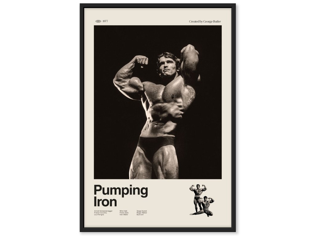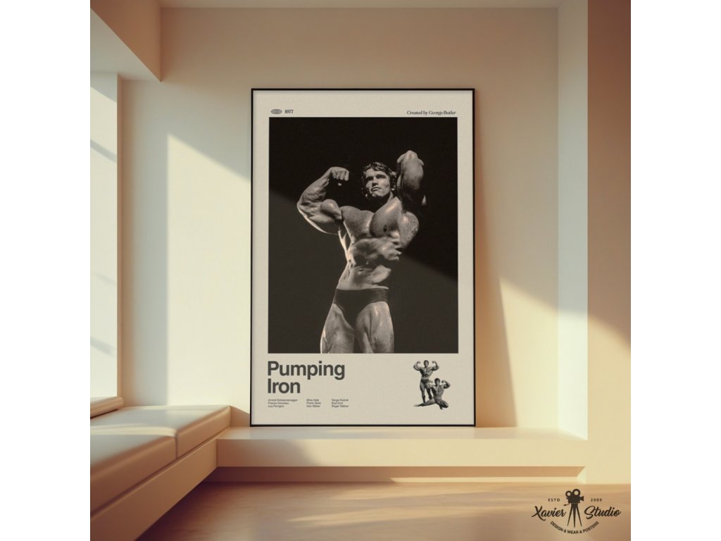 Dokumentární film Pumping Iron z roku 1976 definoval moderní kulturistiku a představil světu mladého Arnolda Schwarzeneggera v jeho vrcholné formě. Tento minimalistický plakát zachycuje sílu, disciplínu a ikonický moment éry „Golden Age of Bodybuilding“.